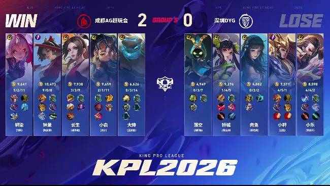 点击链接,讨论本场比赛选手表现2026年王者荣耀职业联赛春季赛常规赛(BO5)Game2:蓝色方:成都AG超玩会 红色方:深圳DYG【Ban/Pick】蓝色方禁用:苏烈 大司命 司空震 老夫子 狂铁选用:轩染-影 钟意-云缨 长生-不知火舞 小俞-蚩奼 大帅-盾山红色方禁用:鲁班大师 女娲 镜 关羽 马超选用:小乐-曹操 小轩-杨戬 向鱼-西施 钎城-孙尚香...